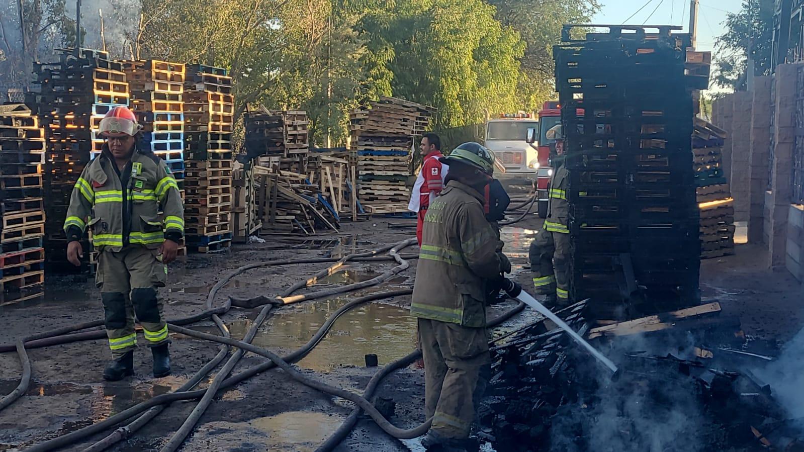 Hermosillo, Sonora; 9 de diciembre, 2024.- Personal de Bomberos sofocó un incendio en una fábrica de tarimas de madera, el cual se registró la tarde de este lunes al norte de la ciudad.