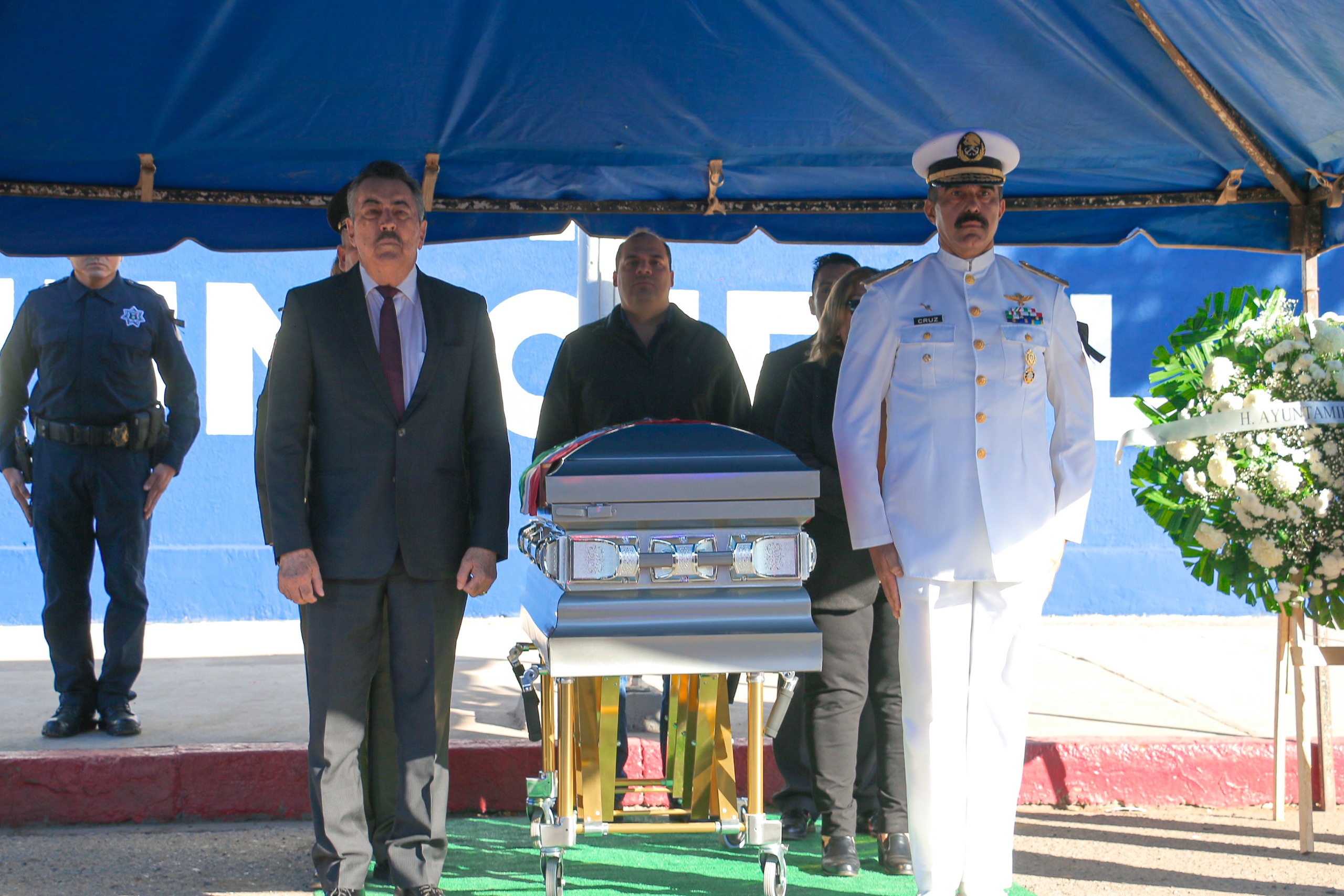 En una emotiva ceremonia encabezada por el Presidente Municipal, Javier Lamarque, familiares, amigos, autoridades y compañeros de la corporación rindieron un homenaje póstumo al oficial Jesús Francisco Ramos Acosta, quien falleció en cumplimiento de su deber.