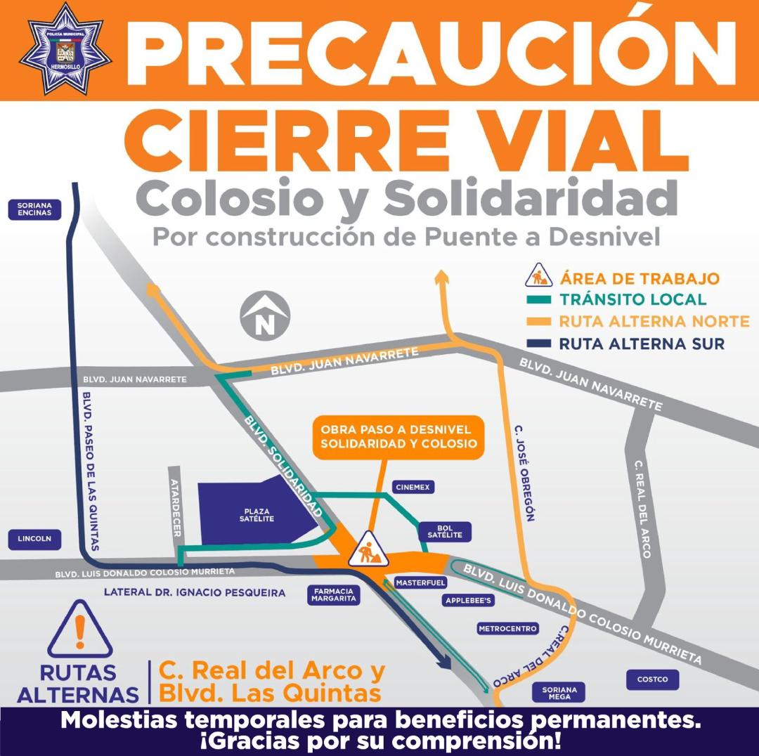 Las rutas alternas para los conductores que transiten del Norte a Sur de la ciudad sobre el bulevar Solidaridad deberán desviarse desde el supermercado Soriana Encinas por el bulevar Paseo de las Quintas hasta llegar al Colosio y retomar hacia el Solidaridad.
