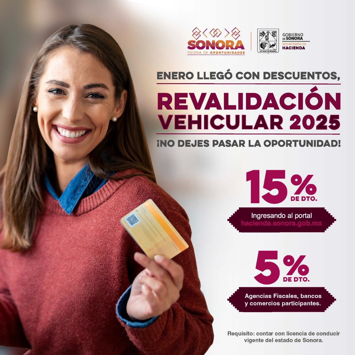 La Secretaría de Hacienda informa que para las y los sonorenses que realicen su pago en bancos y comercios participantes durante enero y febrero contarán con un 5 por ciento de descuento sobre el monto base de la revalidación 2025 y podrán acudir a cualquier Agencia o Sub Agencia Fiscal para recoger su tarjeta de circulación correspondiente.