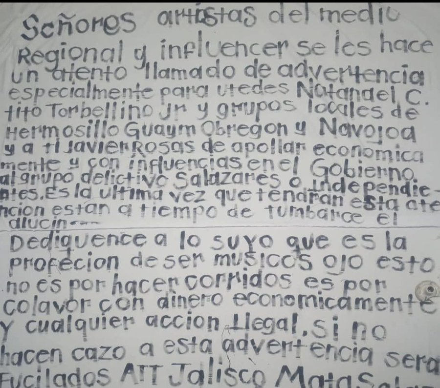 “Dedíquense a lo suyo, que es la profesión de ser músicos (…). Si no hacen caso a esta advertencia, serán fusilados”, se lee en el mensaje firmado por “Jalisco Matasalas”.