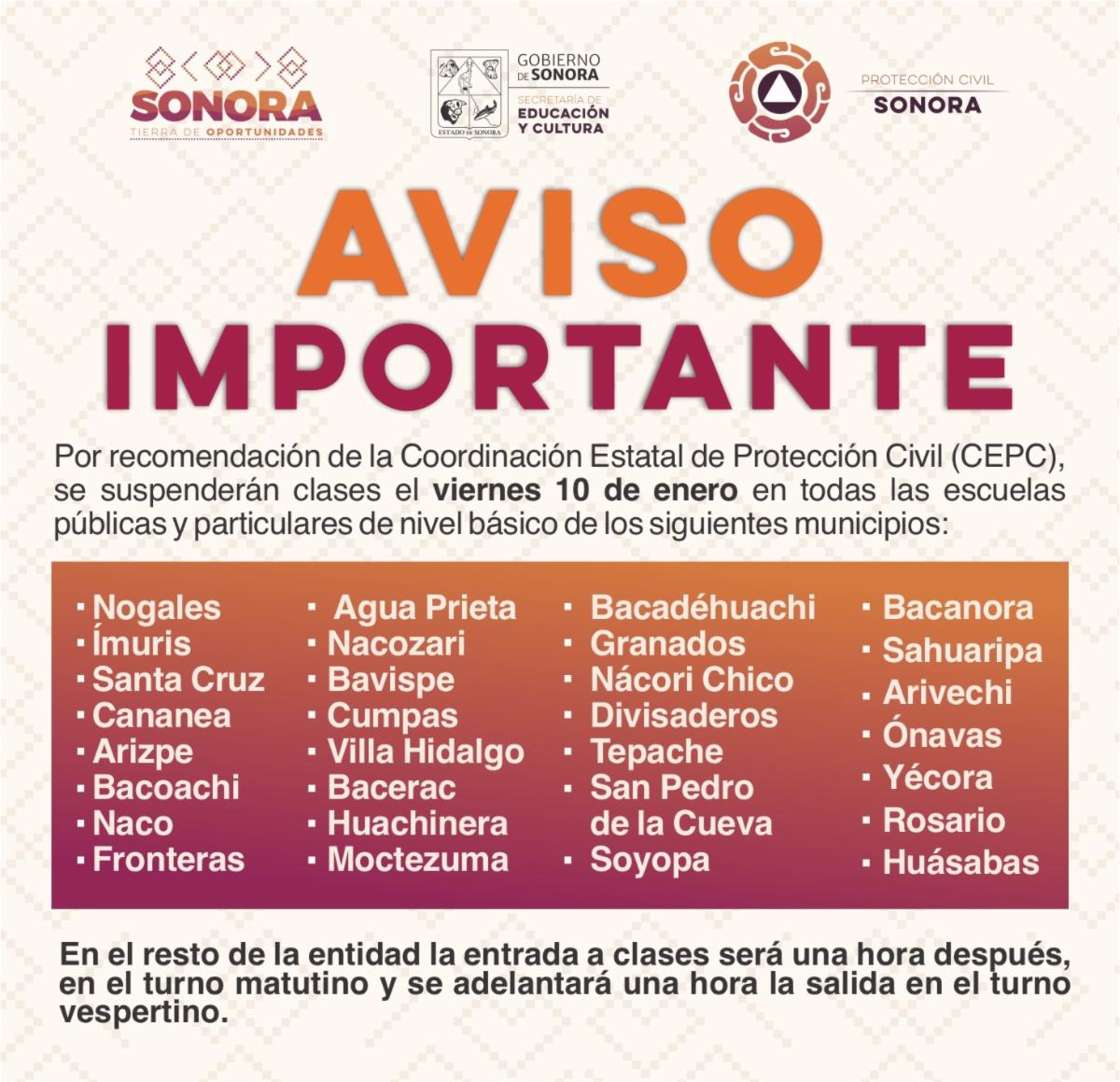 El titular de la Secretaría de Educación y Cultura (SEC) detalló que dichos municipios son Nogales, Ímuris, Santa Cruz, Cananea, Arizpe, Bacoachi, Naco, Fronteras, Agua Prieta, Nacozari, Bavispe, Cumpas, Villa Hidalgo, Bacerac y Huachinera.