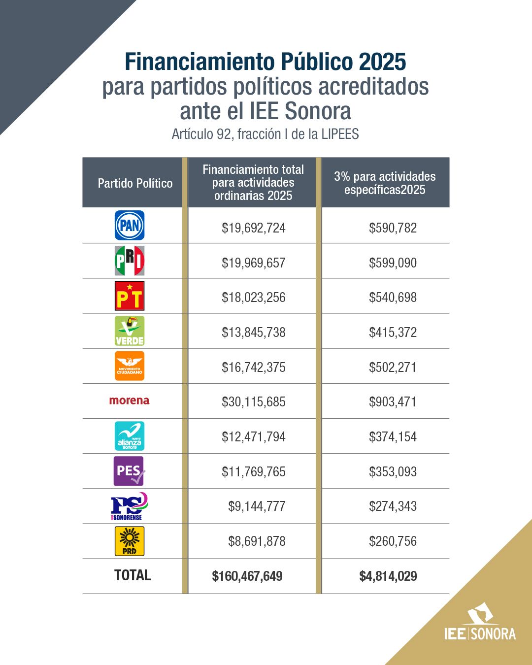 Con la premisa de fortalecer el desarrollo democrático del estado a través de la correcta operación de las organizaciones partidistas, el Consejo General del Instituto Estatal Electoral y de Participación Ciudadana (IEE Sonora), aprobó el financiamiento público que recibirán los diez partidos políticos para actividades ordinarias permanentes y actividades específicas durante el ejercicio fiscal 2025, por un monto total de 160 millones 467 mil 648 pesos con 84 centavos.