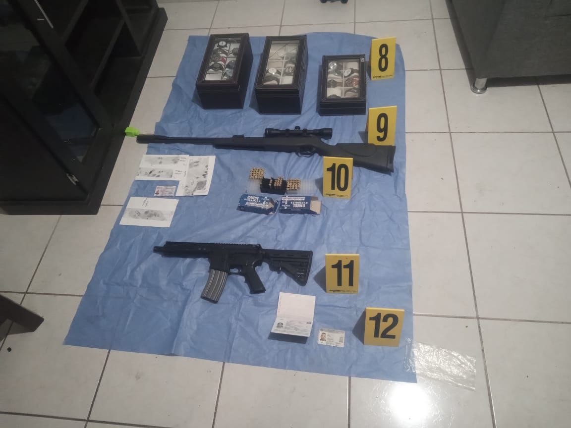 También se aseguró un fusil de asalto AR-15 con 20 cartuchos calibre .223, un rifle de postas calibre 5.5, y 49 cartuchos calibre .38 Súper; dentro del inmueble fueron localizados dos vehículos: una pickup GMC modelo 2015 y un Jeep Grand Cherokee modelo 2016, ambos sin reporte de robo.