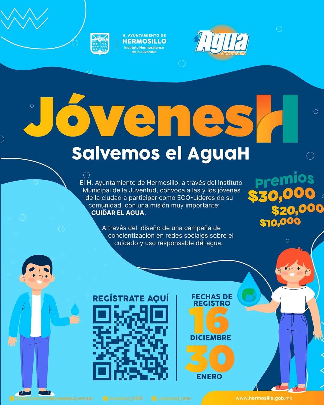 Hermosillo, Sonora; 20 de enero, 2025.- Jóvenes residentes de Hermosillo, de entre 15 y 29 años de edad, aún pueden registrarse en la convocatoria “Jóvenes H Salvemos el Agua” para diseñar una campaña de concientización en redes sociales sobre el uso responsable del agua.