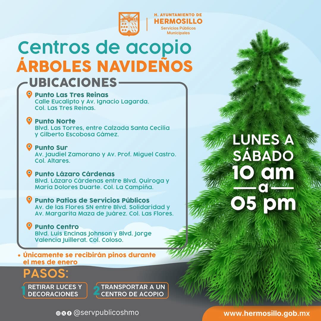 Hermosillo, Sonora; 22 de enero, 2025.- Para dar facilidades a la ciudadanía de Hermosillo, en el manejo de los pinos navideños naturales, Servicios Públicos Municipales seguirá recibiendo estos pinos en seis centros de acopio ubicados en varios sectores de la ciudad.