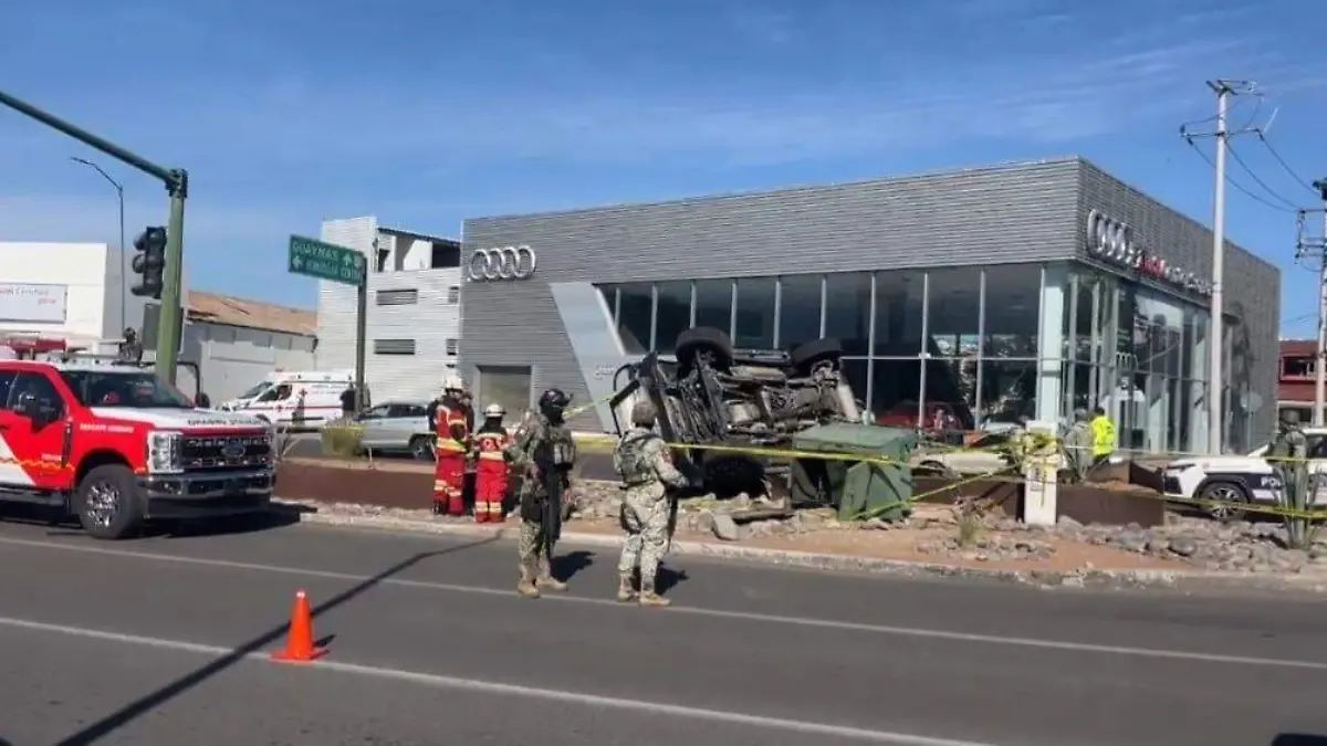 Una unidad perteneciente al Ejército Mexicano se volcó esta mañana sobre el bulevar Eusebio Kino casi a la altura del bulevar Morelos, aparentemente por circular a exceso de velocidad.
