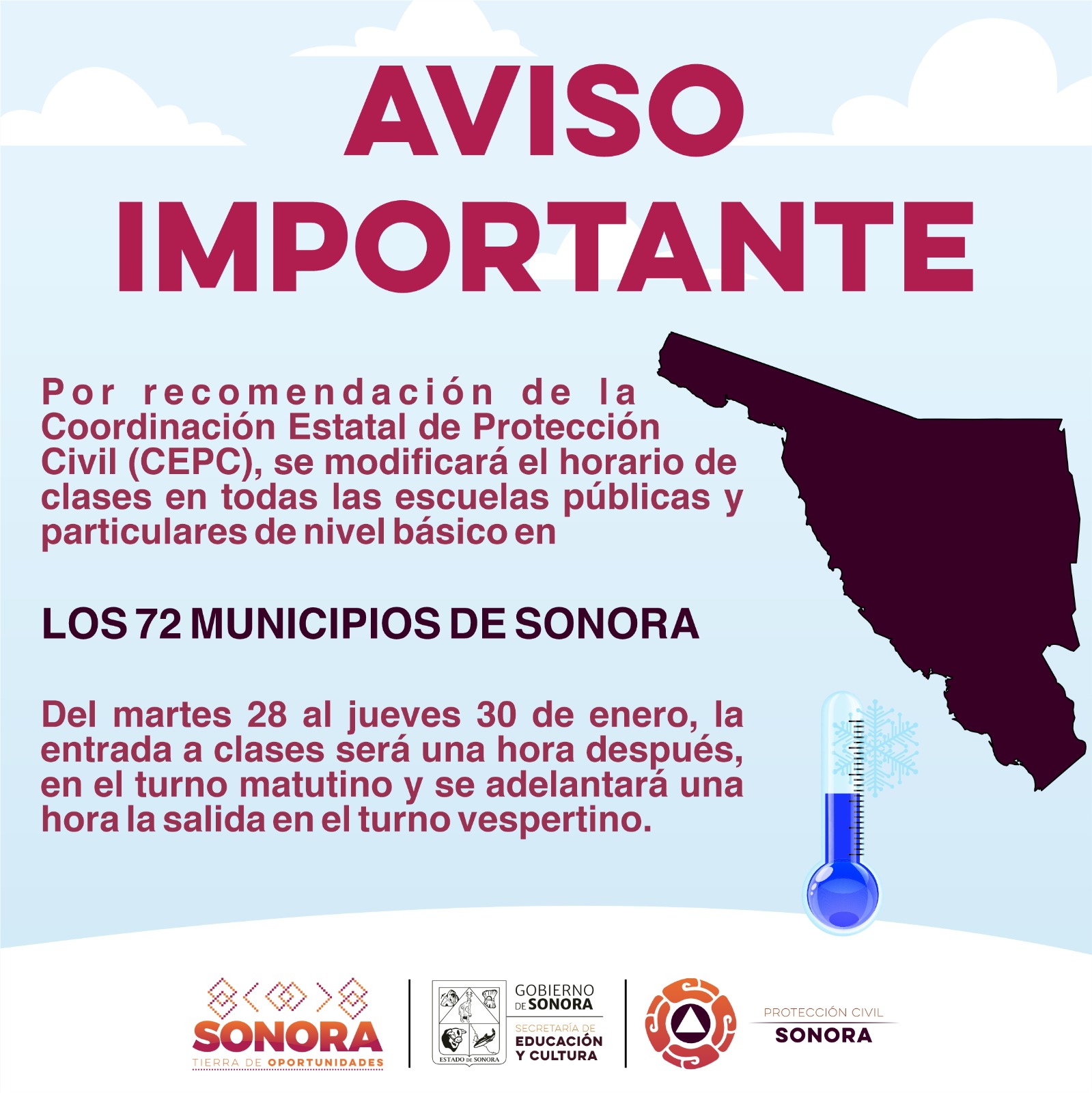Hermosillo, Sonora; 27 de enero de 2025.- Ante los pronósticos de bajas temperaturas, la Coordinación Estatal de Protección Civil (CEPC) recomendó a la Secretaría de Educación y Cultura (SEC) la modificación del horario de clases en los 72 municipios sonorenses del martes 28 al jueves 30 de enero, anunció Froylán Gámez Gamboa.