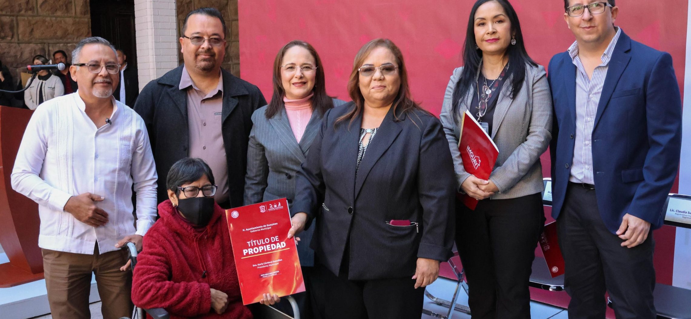 Presentes en esta entrega de títulos, Claudia Susana Izaguirre Fimbres, registrador suplente de la Oficina de Jurisdicción de Servicios Registrales de Guaymas; la regidora presidenta de la Comisión de Hacienda y Cuenta Pública, María del Pilar Hernández Félix; el Tesorero Municipal Daniel Apodaca Larrinaga, así como beneficiarios.