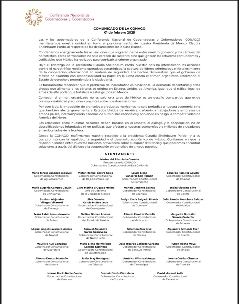 La Conferencia Nacional de Gobernadores (CONAGO), encabezada por la gobernadora de Baja California, Marina del Pilar Avila Olmeda, emitió un comunicado donde rechaza la sugerencia de supuestos vínculos entre el gobierno mexicano y el crimen organizado, por parte de la Casa Blanca, y respalda la postura de la presidenta de México, Claudia Sheinbaum Pardo.