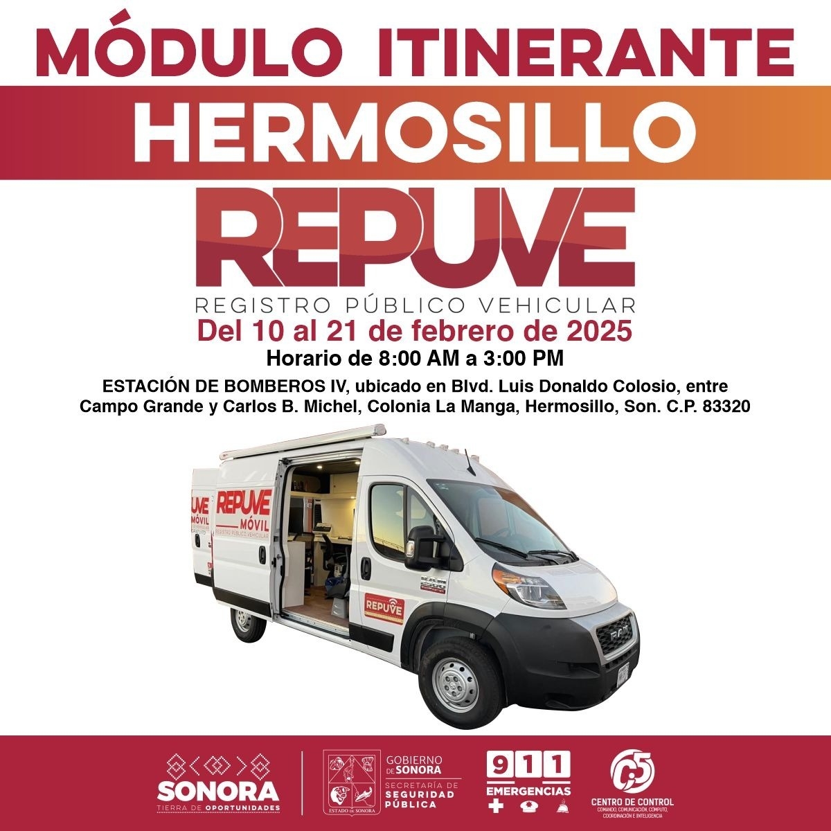Hermosillo, Sonora; 6 de febrero de 2025.- Del 10 al 21 de febrero estará el módulo itinerante del Registro Público Vehicular (Repuve) atendiendo en Hermosillo a todas las personas interesadas en regularizar autos usados de procedencia extranjera, informó la Secretaría de Seguridad Pública (SSP).