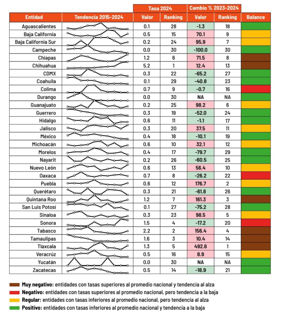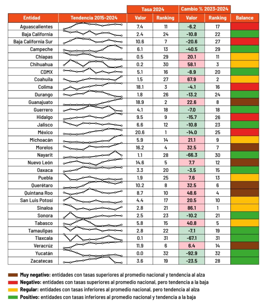 De acuerdo con el informe, seis entidades presentan un balance muy negativo en cuanto a este delito: Guanajuato, Morelos, Nuevo León, Querétaro, Quintana Roo y Veracruz.