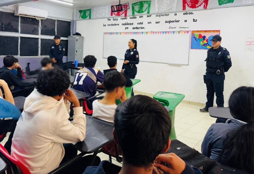 Los elementos de la división de Proximidad Ciudadana, en coordinación con autoridades de la Secretaría de Educación y Cultura (SEC), durante las sesiones impartidas en escuela secundaria Técnica Estatal número 17, ubicada en la colonia Tierra Nueva, expusieron temas relacionados con los riesgos del uso de vapeadores, se promovieron conductas prosociales, decir no al bullying y el amor a la patria.