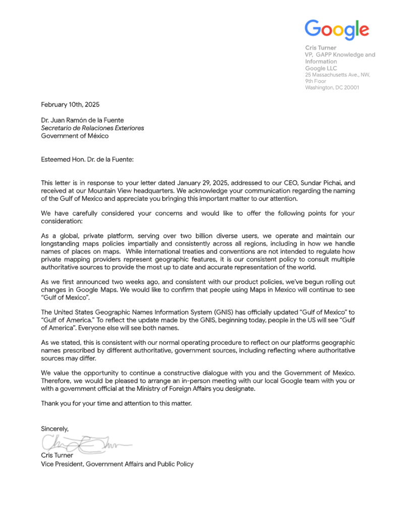 Sheinbaum Pardo exhibió una misiva que envió la compañía el 10 de febrero al canciller mexicano, Juan Ramón de la Fuente, en la que argumenta que el cambio es consistente con una actualización del Sistema de Información de Nombres Geográficos de Estados Unidos (GNIS) tras el decreto de Trump del 20 de enero.