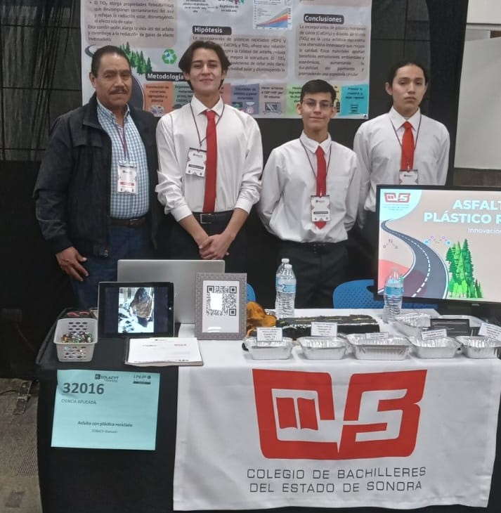 Por su parte, añadió el funcionario, Rafael Ramos Cruz, Jacob Ulises Franco Yedra y Gabriel Alejandro Hernández Zúñiga, del plantel Nacozari, presentaron el proyecto “Asfalto plástico” elaborado con botellas de plástico reciclado para reducir la contaminación y mejorar la infraestructura vial, con el cual obtuvieron la plata.