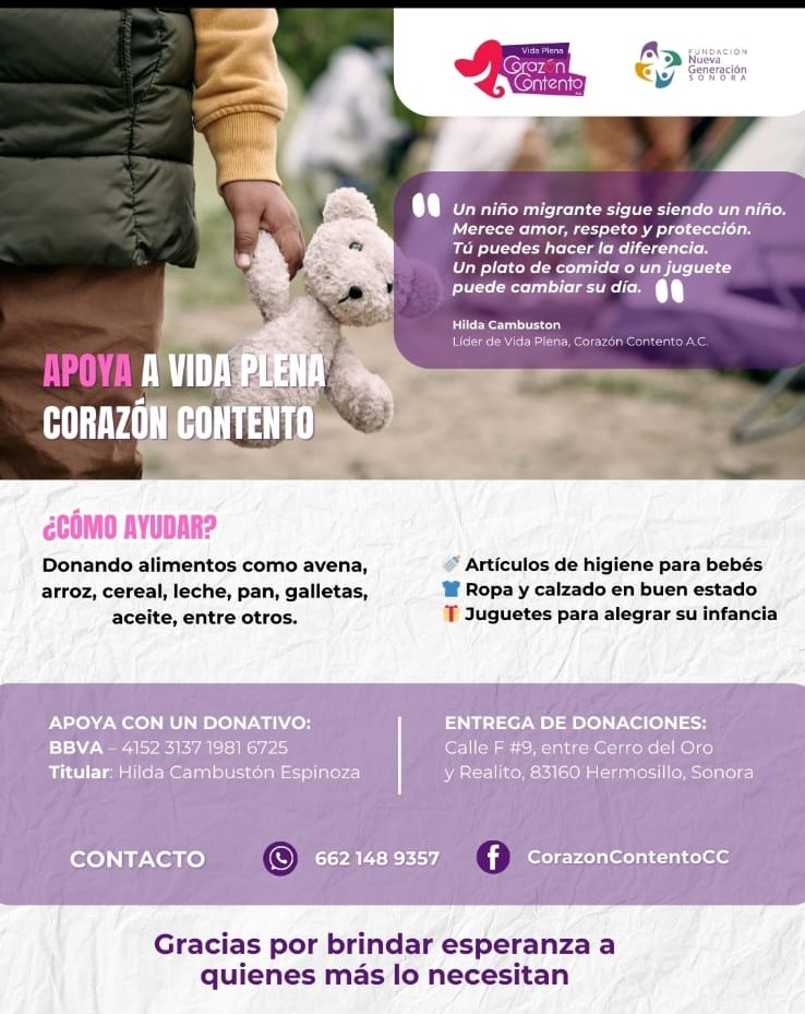 Hermosillo, Sonora a febrero de 2025.- La Fundación Nueva Generación Sonora, en sus acciones de contribuir al bienestar integral de la infancia, este mes dedica su publicación al tema Niñas, Niños y Adolescentes Migrantes: Una Crisis Silenciosa en Sonora y además, se une a la causa de la Asociación Vida Plena, Corazón Contento, que en este momento dedica sus esfuerzos en apoyo a la población migrante.