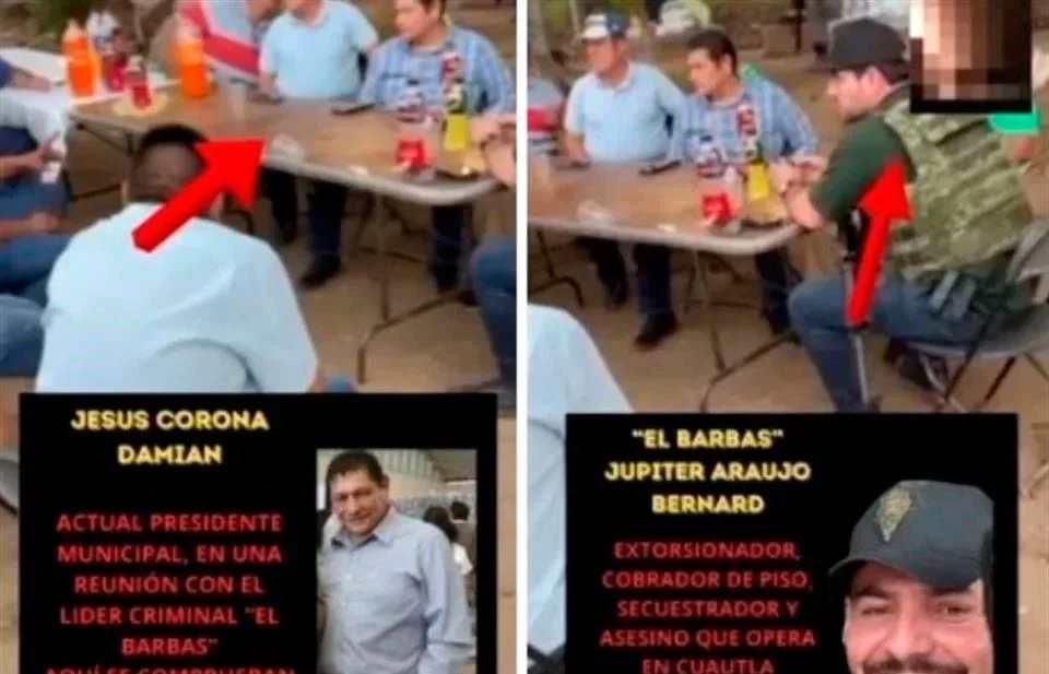 Morelos.- Jesús Corona Damián y Agustín Toledano Amaro, Alcaldes panistas de Cuautla y Atlatlahucan, respectivamente, aparecen en un video reunidos con un sujeto con un arma larga y un chaleco antibalas señalado como Júpiter Araujo Bernard, “El Barbas”, presunto líder del Cártel de Sinaloa (CDS) en Morelos.