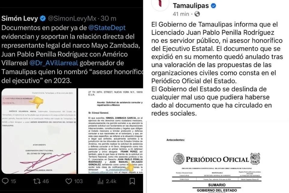 Este sábado, Levy publicó un mensaje en su cuenta de X, en el que afirmó que documentos en poder del Departamento de Estado de los Estados Unidos evidencian y respaldan la relación directa entre Juan Pablo Penilla Rodríguez, representante legal de “El Mayo”, y el Mandatario Estatal de Tamaulipas.