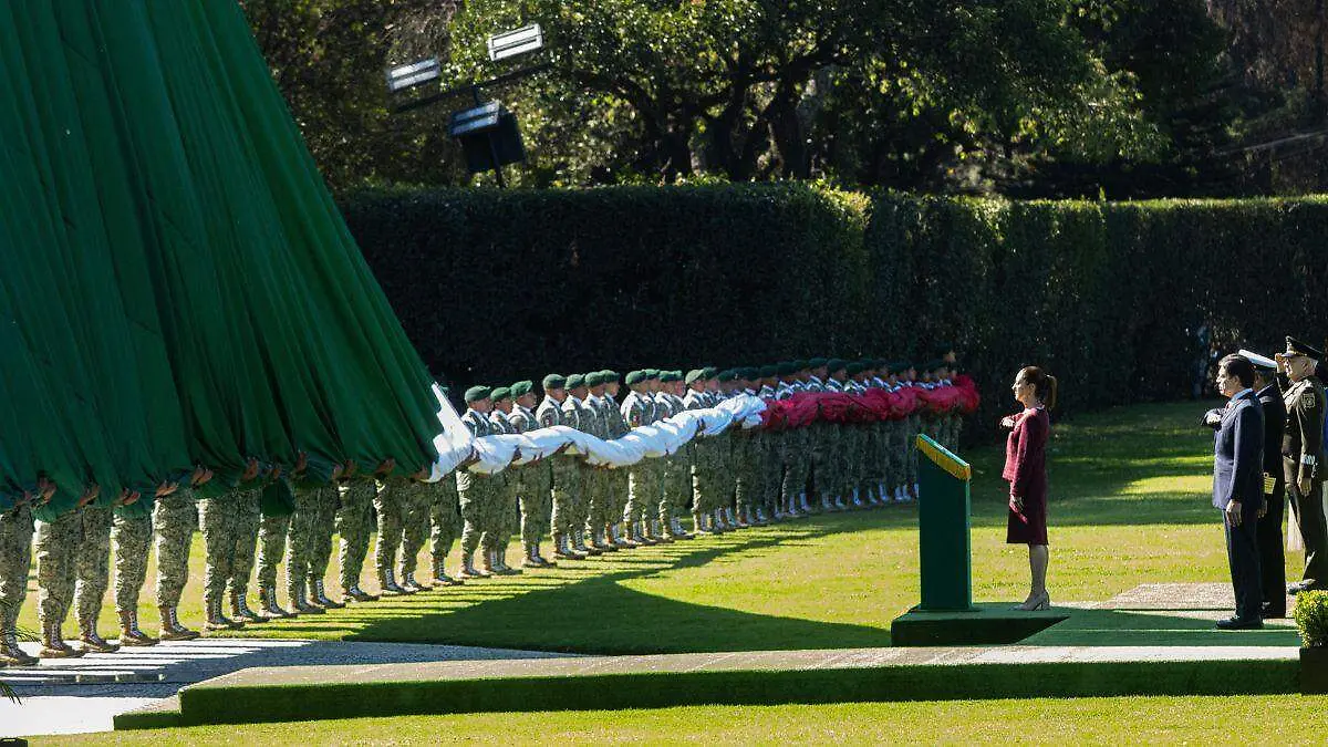 En la conmemoración del Día de la Bandera en Campo Marte, la presidenta Claudia Sheinbaum aseveró que “ya no es como antes que los gobiernos se arrodillaban ante gobiernos extranjeros o que miraban fuera como ejemplo a seguir”