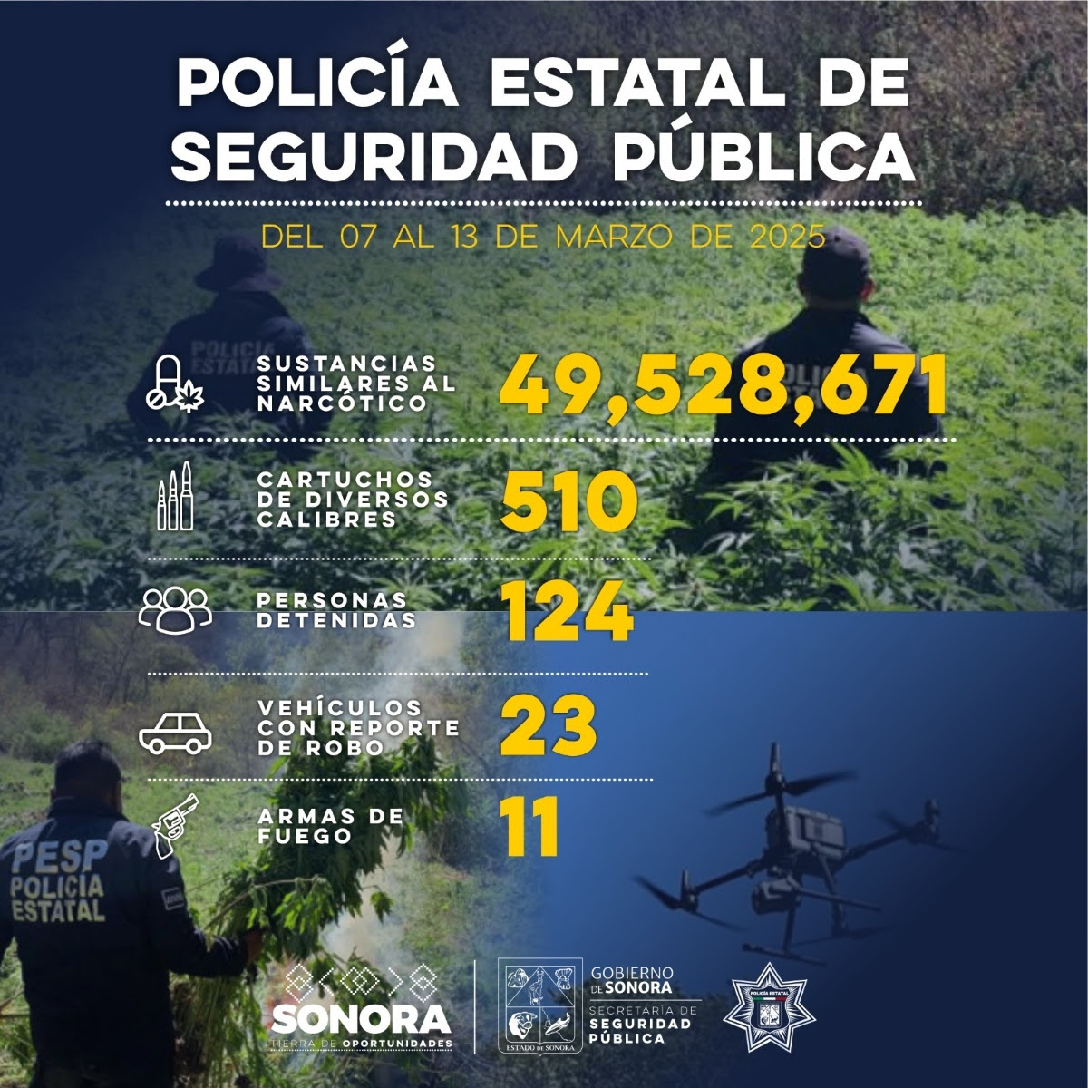 Con los operativos que se realizaron en el Estado, la corporación ha registrado la incautación de lo equivalente a 49 millones 528 mil 671 dosis de sustancias con características similares al narcótico, destacando el hallazgo de cinco plantíos que fueron destruidos en los límites de Sonora-Chihuahua, donde se intervino con grupos especializados de inteligencia y uso de tecnología aérea.