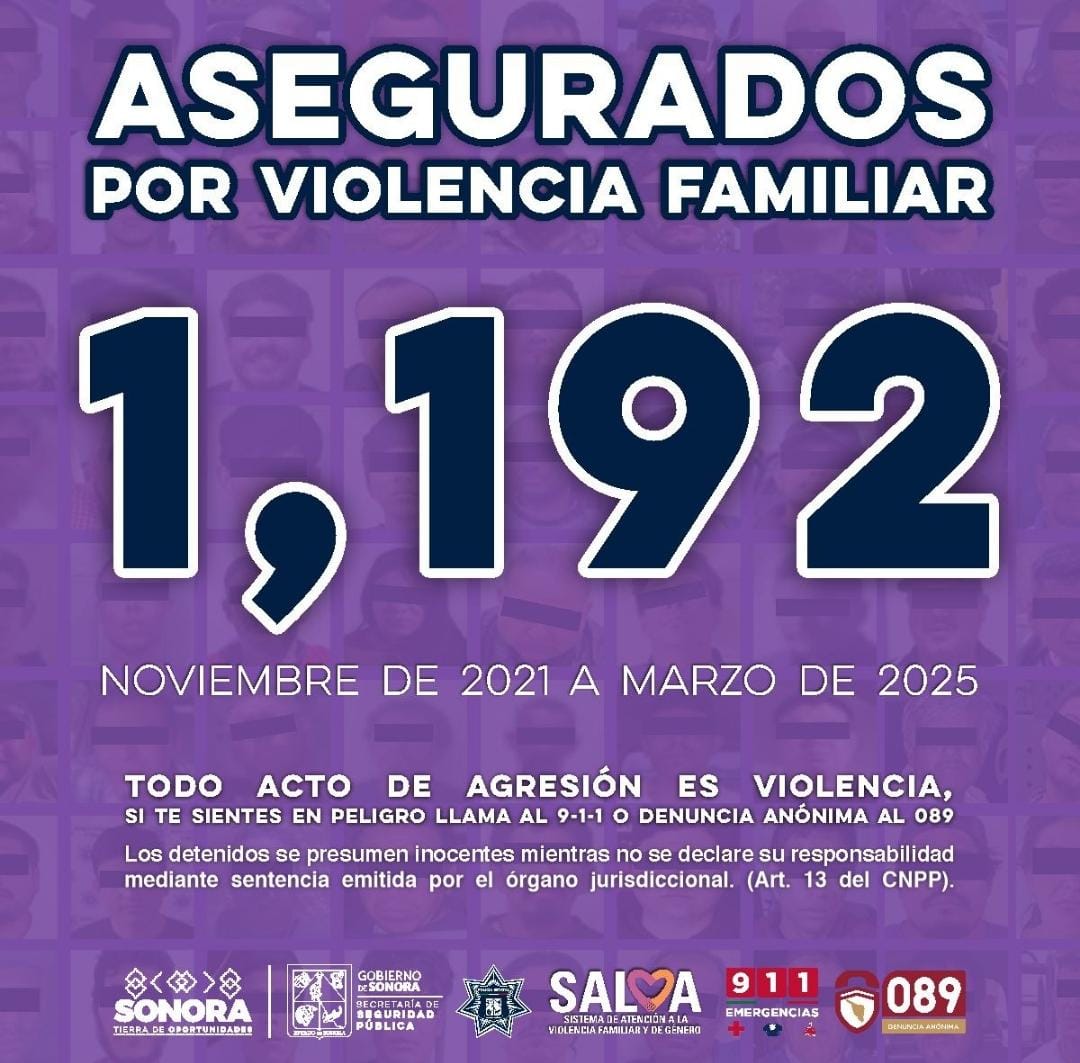 Hermosillo, Sonora; 17 de marzo de 2025.- Con las acciones que promueve el Gobierno de Sonora para el seguimiento de los reportes por violencia familiar, la Secretaría de Seguridad Pública (SSP) ha registrado la detención de mil 192 personas por este delito, de noviembre de 2021 a la fecha, informó Víctor Hugo Enríquez García.
