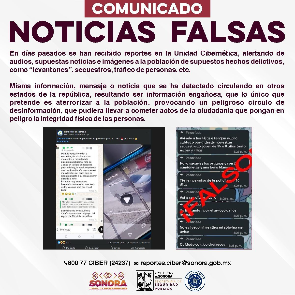 Para consultas sobre identificación de Fake News la ciudadanía puede comunicarse al teléfono de la Unidad Cibernética 800 77 24237 o vía correo electrónico reportes.ciber@sonora.gob.mx.
