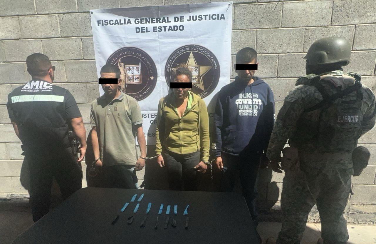 En una segunda acción, en la calle Quinta del Periférico, en la colonia Luis Encinas, se ejecutó otro cateo, logrando la detención de Juan Carlos “N”, de 35 años; Francisco Javier “N”, de 40; Guadalupe Sarahí “N”, de 36, y José Jesús “N”, de 49. Durante la intervención se aseguraron 22 envoltorios de plástico con “cristal”.