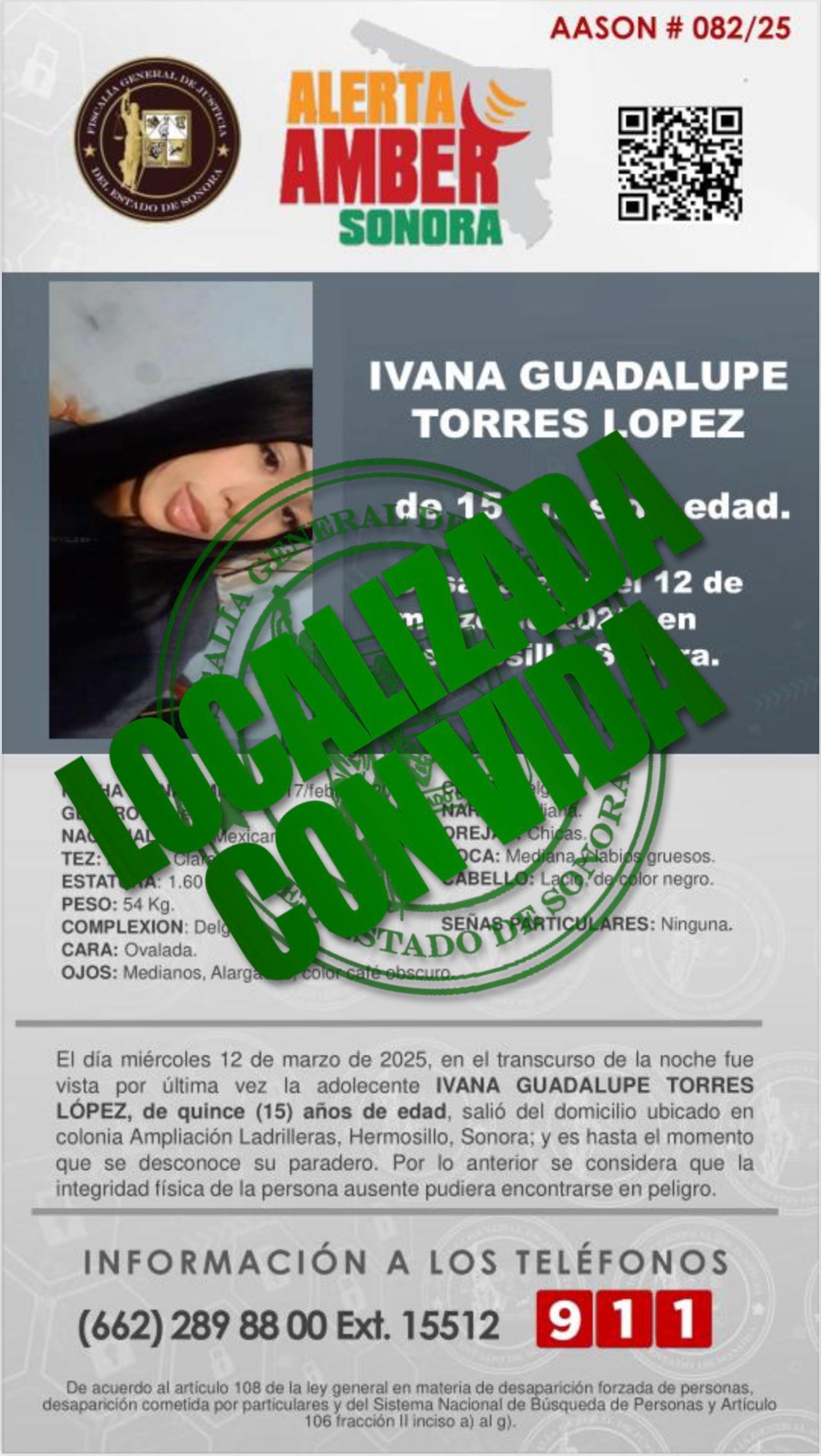 Hermosillo, Sonora, 29 de marzo de 2025.- La Fiscalía General de Justicia del Estado de Sonora (FGJES) informa que la menor Ivana Guadalupe “N” de 15 años de edad, fue localizada con vida por elementos de la Agencia Ministerial de Investigación Criminal, tras haberse ido de su domicilio el pasado 12 de marzo en la noche; de acuerdo con las investigaciones realizadas, la menor se ausentó por voluntad propia para dirigirse a casa de su novio.