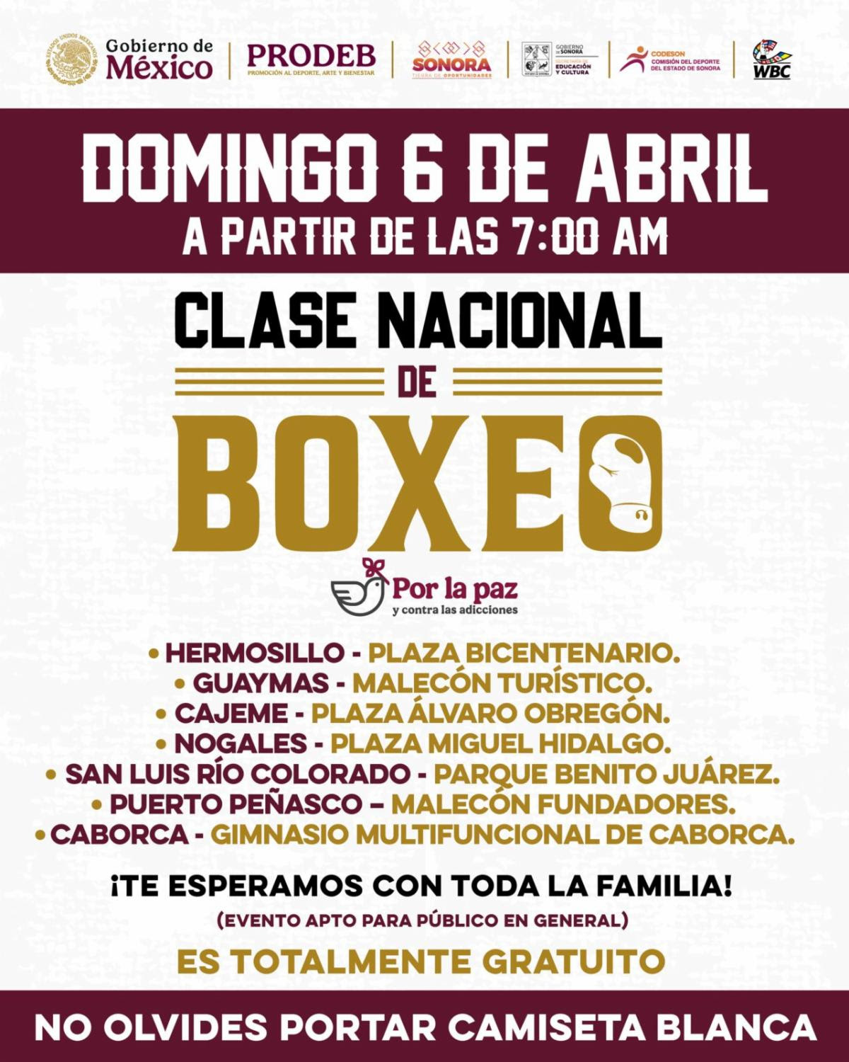 Hermosillo, Sonora; 4 de abril de 2025.- El Gobierno de Sonora extiende una cordial invitación a todas las familias sonorenses a unirse a la Clase Nacional de Boxeo 2025, que se llevará a cabo este domingo 6 de abril, con el propósito de promover la paz y luchar contra las adicciones, a través del deporte.