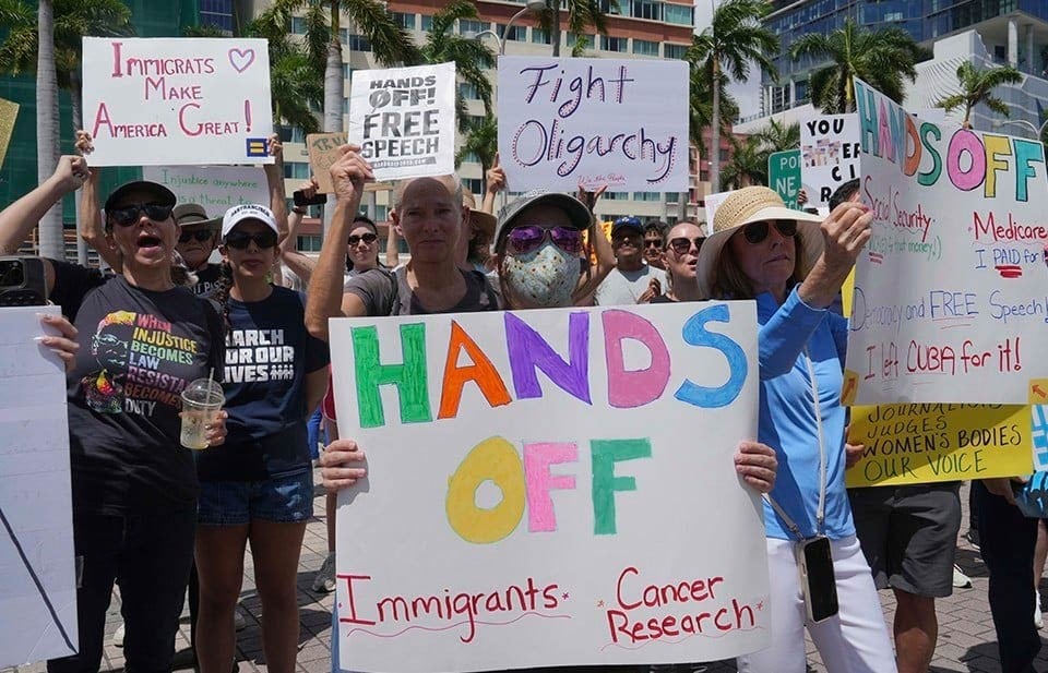 En Massachusetts, miles de personas se reunieron en Boston Common con carteles que decían “Manos fuera de nuestra democracia”, “Manos fuera de nuestro Seguro Social” y “La diversidad, equidad e inclusión hacen fuerte a Estados Unidos. ¡Manos fuera!”