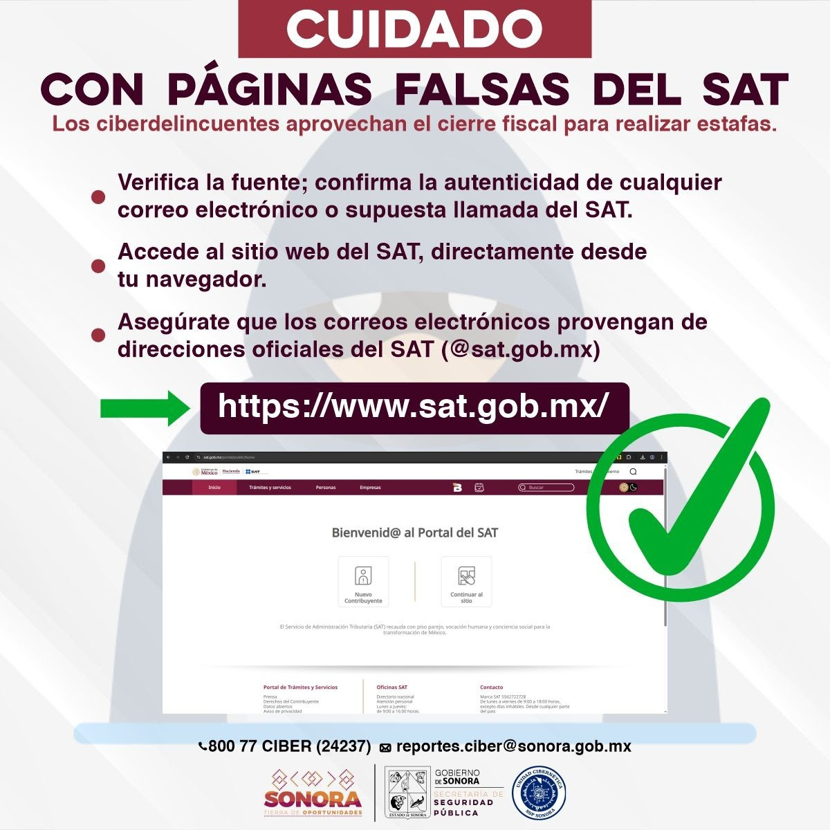 Hermosillo, Sonora; 7 de abril de 2025.- Para evitar que contribuyentes y el público en general sean víctimas de estafas y fraudes a través de páginas web y correos electrónicos que suplantan la identidad del Sistema de Administración Tributaria (SAT), la Unidad Cibernética de la Secretaría de Seguridad Pública (SSP) de Sonora recomendó extremar las medidas de prevención.