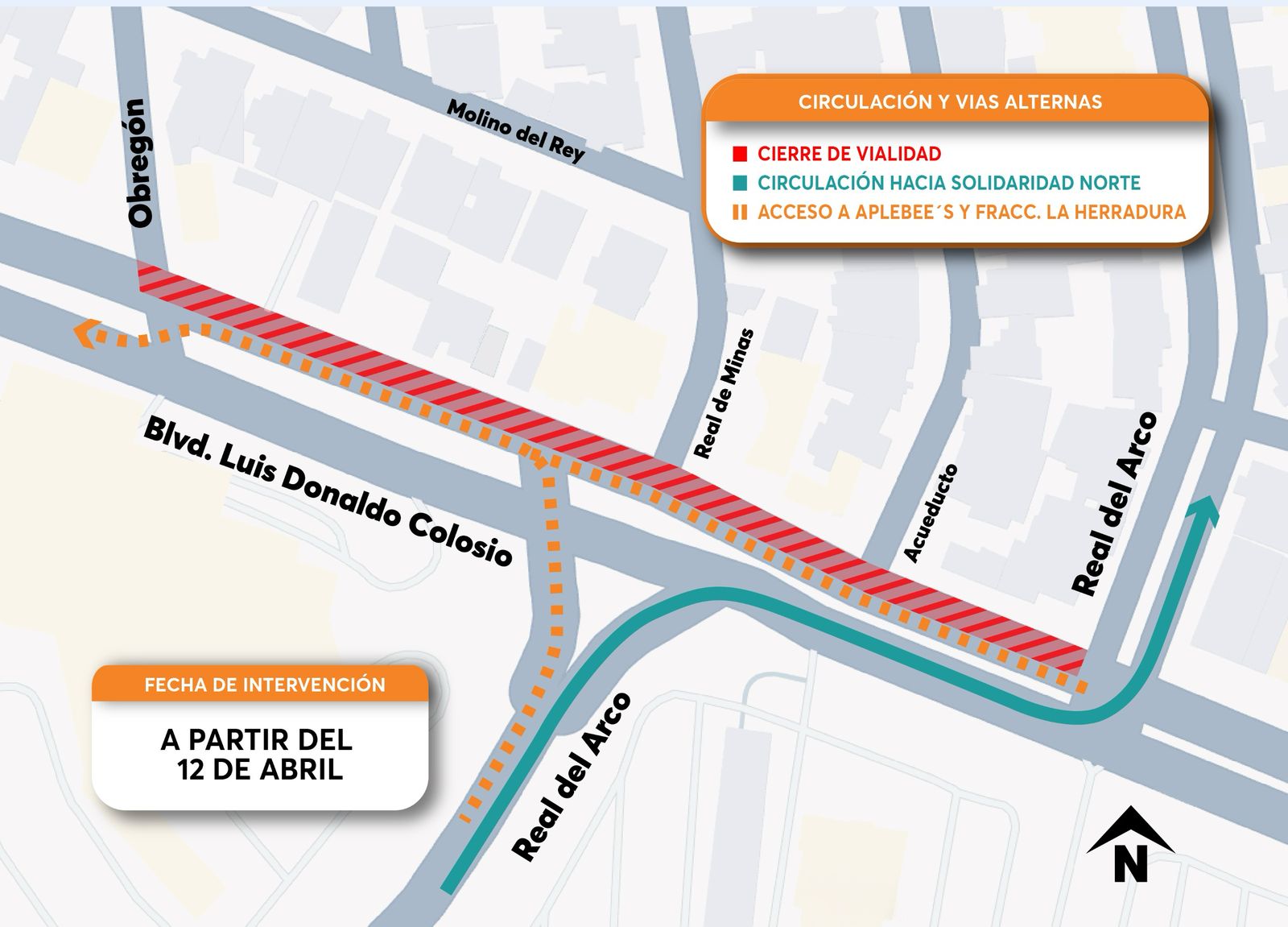 Hermosillo, Sonora; 11 de abril, 2025.- Por la renovación de tubería de drenaje en el cuerpo norte del bulevar Colosio, a partir de este sábado 12 de abril se cerrará la vialidad, entre Real del Arco y José Obregón, además de la Calle José Obregón a la altura del Blvd. Colosio; la desviación hacia el poniente será la calle Real del Arco.