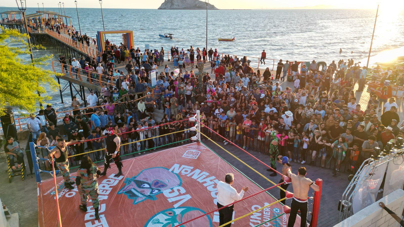 Hermosillo, Sonora; 19 de abril, 2025.- Con una gran afluencia de espectadores de todas las edades se llevó a cabo la función de lucha libre entre el Cochinón y El Patrullero Verde, en la explanada frente al muelle de Bahía de Kino.