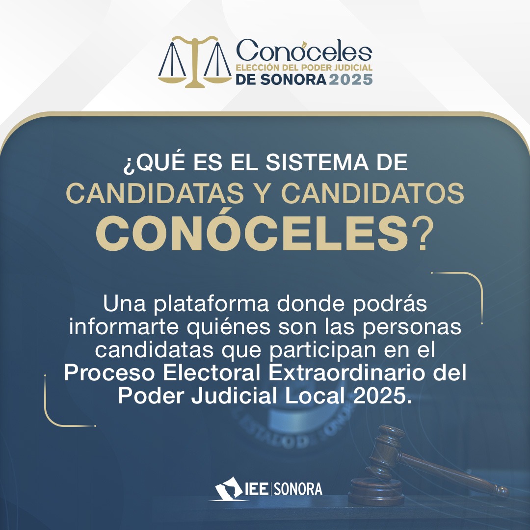 Este martes inició operaciones el sistema “Conóceles” para la elección de integrantes del Poder Judicial, habilitado por el Instituto Estatal Electoral y de Participación Ciudadana (IEE Sonora), con el objetivo de acercar la información de las personas candidatas que participan en esta jornada extraordinaria.