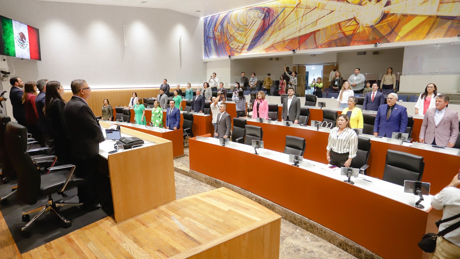 Una vez aprobado el Decreto que clausura el segundo periodo de sesiones ordinarias del primer año de ejercicio constitucional de la 64 Legislatura, diputadas, diputados y público en general entonaron el Himno Nacional.
