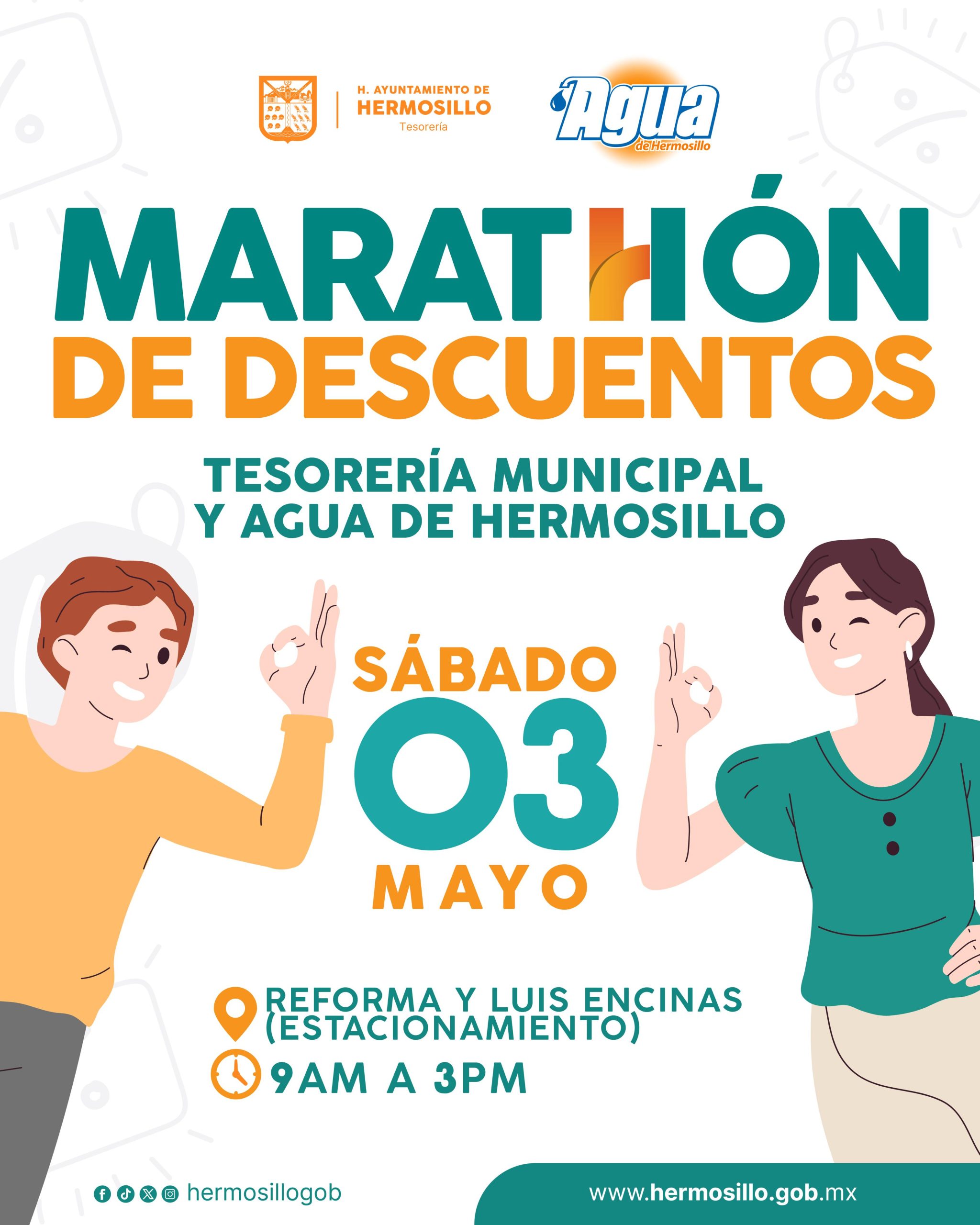 Hermosillo, Sonora; 01 de mayo, 2025.- Contribuyentes de Tesorería Municipal y Agua de Hermosillo que deseen ponerse al corriente tendrán una serie de descuentos en recargos de predial, multas de tránsito, además en adeudos de consumo del vital líquido en el Maratón de Descuentos de este sábado 3 de mayo.