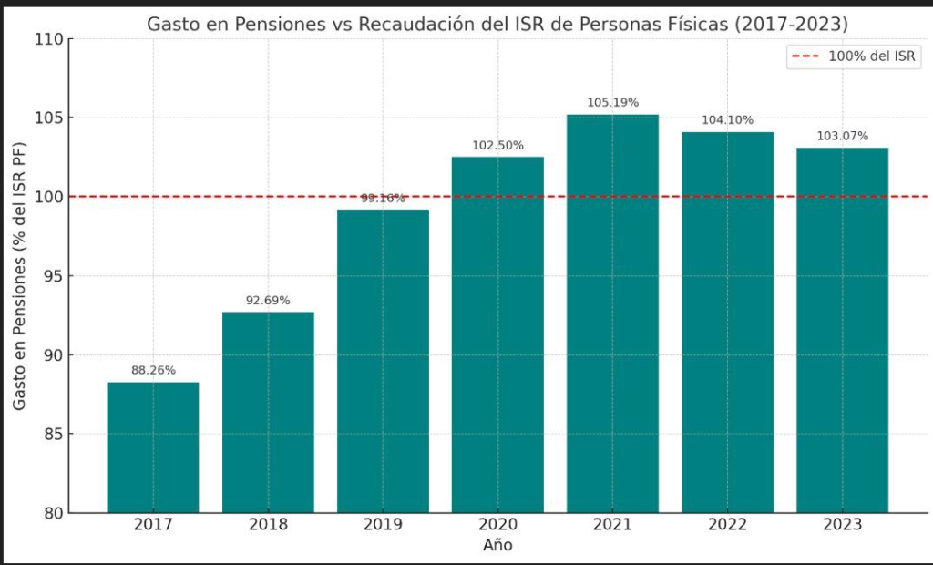 En 2023, el gasto en pensiones ascendió a 1.3 billones de pesos, mientras que la recaudación por ISR de personas físicas fue de apenas 1.26 billones. Esto representó un gasto 3% superior a los ingresos generados por ese concepto.