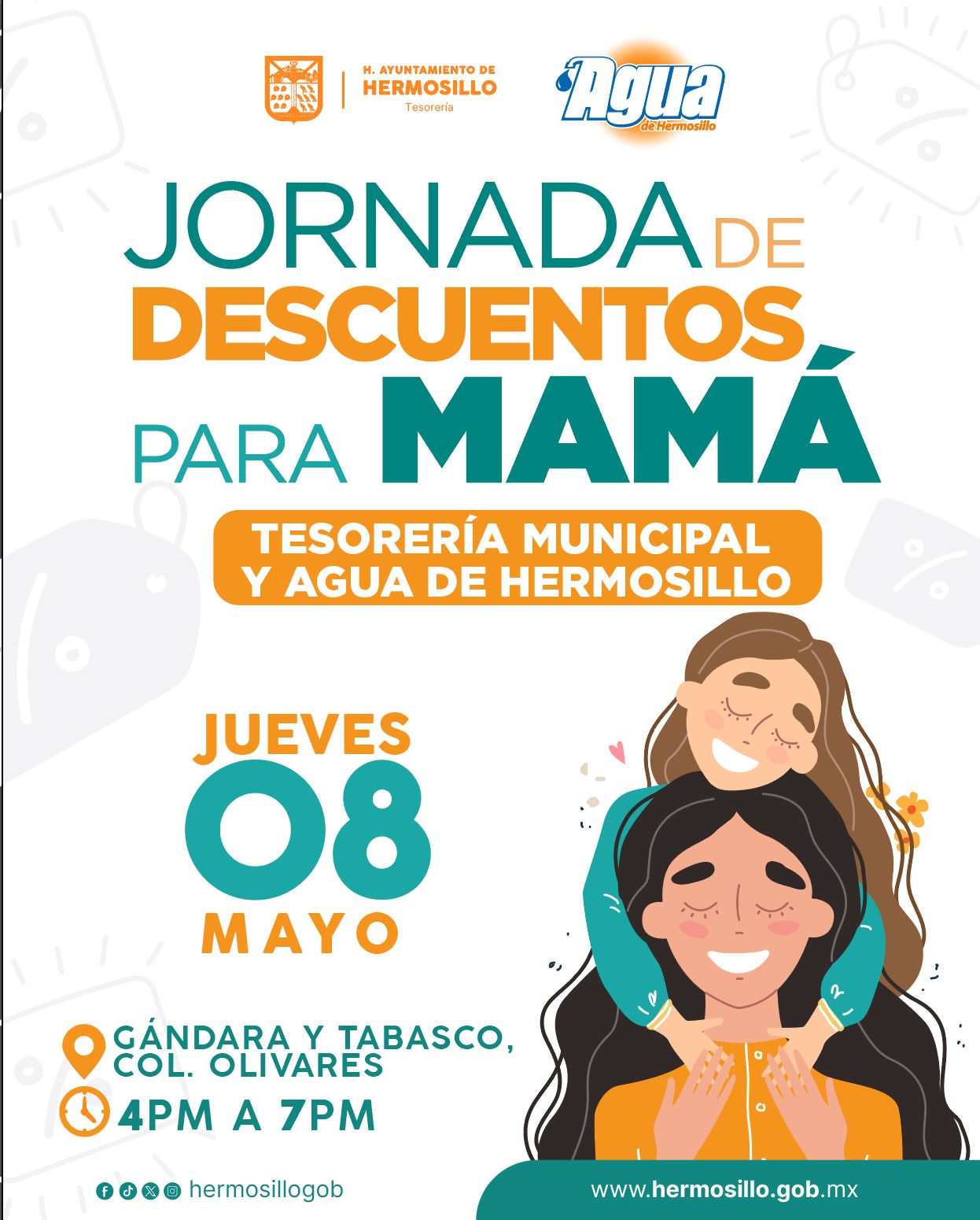 Hermosillo, Sonora; a 7 de mayo de 2025.- Una invitación a aprovechar la Jornada de Descuentos para Mamá extendieron Tesorería Municipal y Agua de Hermosillo este jueves 8 de mayo de 4:00 pm a 7:00 pm en Gándara y Tabasco de la colonia Olivares.