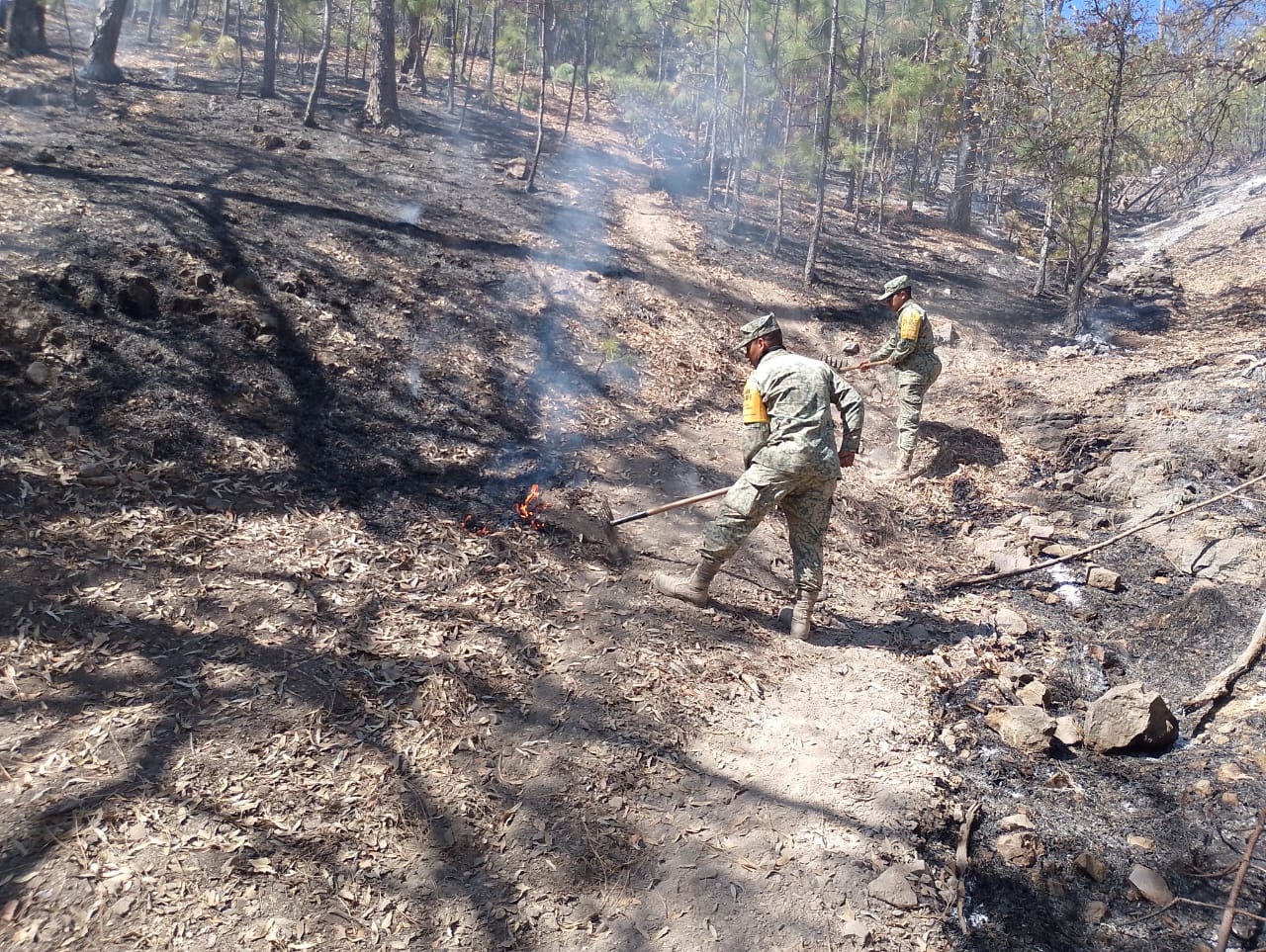 El personal militar realiza diversas labores de combate a incendios, empleando herramientas de mano para la elaboración de brechas contra fuego, con el fin de lograr la sofocación total de este incendio en el menor tiempo posible.