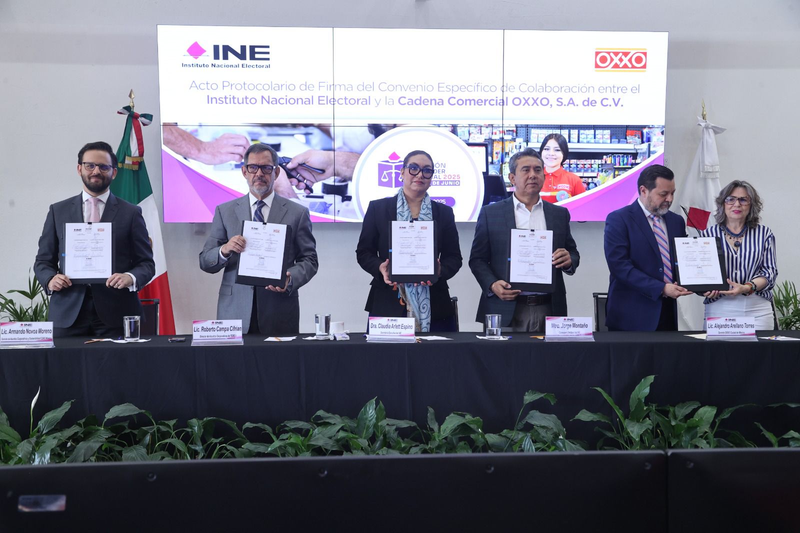 En el acto protocolario también estuvieron presentes la Directora Ejecutiva de Capacitación Electoral y Educación Cívica del INE, María Elena Cornejo Esparza y el Gerente de Asuntos Corporativos y Sostenibilidad de OXXO, Armando Novoa Moreno.