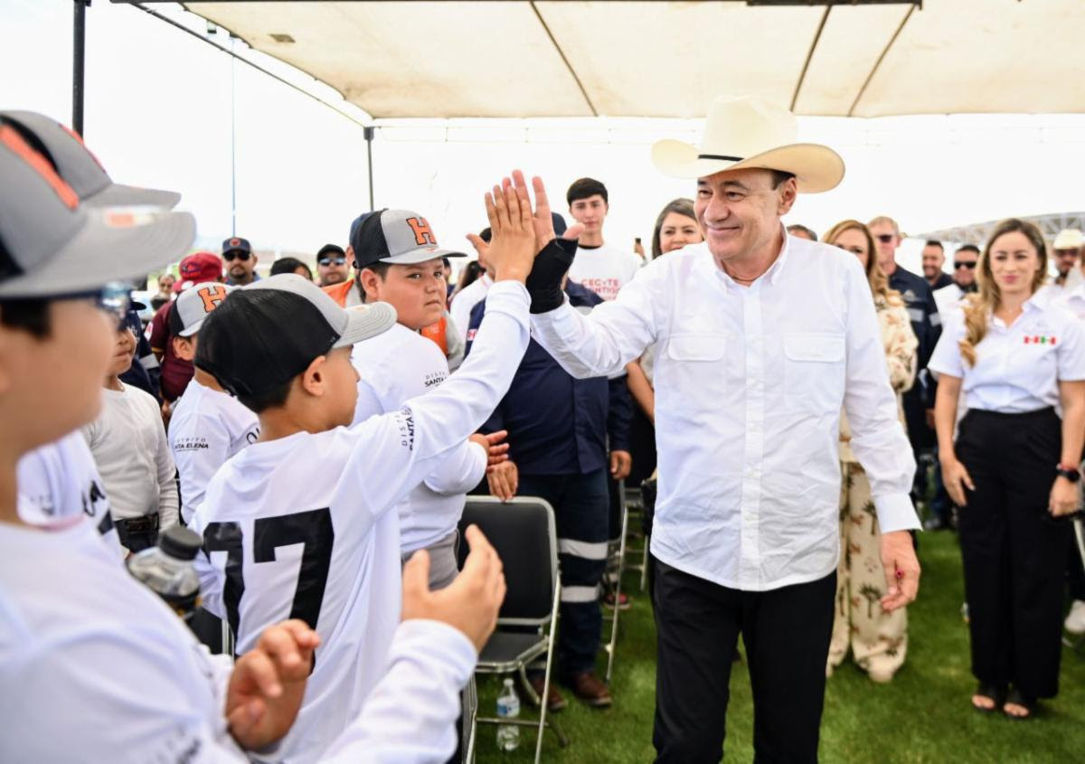 Acompañado por Edna Patricia Serrano Peña, presidenta municipal de Banámichi; Steve Holmes, director de Operaciones de la empresa minera First Majestic Silver Corp y Javier Villareal Gámez, secretario General del Sindicato Nacional de Trabajadores de la Industria Minera Metalúrgica CTM, el mandatario estatal develó la placa conmemorativa y participó en el lanzamiento de la primera bola en la nueva cancha de béisbol, marcando el arranque simbólico de las actividades deportivas en este espacio renovado.