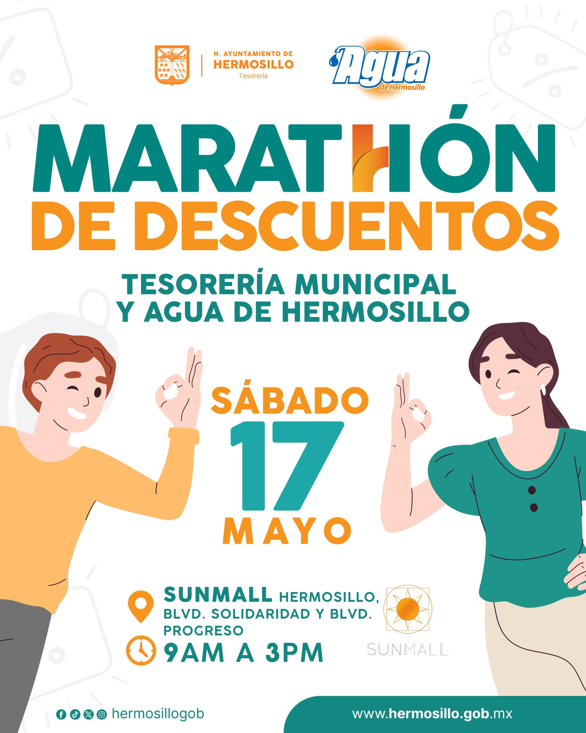Hermosillo, Sonora; 15 de mayo de 2025.- Residentes del norte de la ciudad podrán aprovechar los beneficios del “Marathón de Descuentos” del Ayuntamiento de Hermosillo este sábado 17 de mayo en SUNMALL ubicado en los cruces de los bulevares Solidaridad y Progreso de 9:00 am a 3:00 pm.