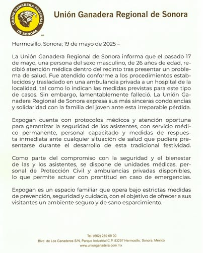 “La Unión Ganadera Regional de Sonora expresa sus más sinceras condolencias y solidaridad con la familia del joven ante esta irreparable pérdida. Expogan cuenta con protocolos médicos y atención oportuna para garantizar la seguridad de los asistentes, con servicio médico permanente, personal capacitado y medidas de respuesta inmediata ante cualquier situación de salud que pudiera presentarse durante el desarrollo de esta tradicional festividad”, se lee en el comunicado oficial.