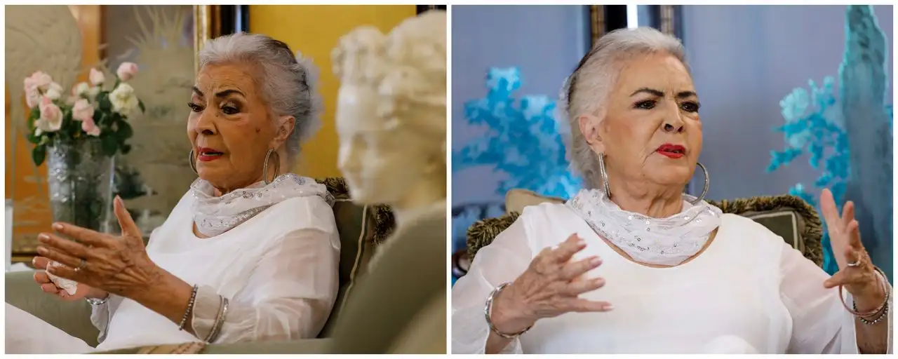 La actriz luce contenta, en paz, aunque dijo depender por momentos del oxígeno debido a problemas en sus pulmones. Una sombra oscurece sus ojos cuando recuerda el reciente fallecimiento de su querida hermana Alma Rosa. Aquí tengo sus cenizas, aunque sé que ella ya no está ahí.