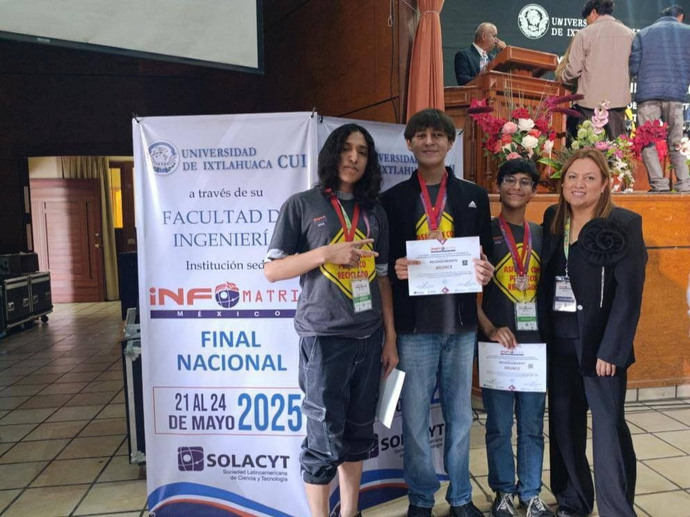 Rafael Ramos Cruz, Gabriel Alejandro Hernández Zúñiga y Jacob Ulises Franco Yedra, acompañados de su maestro asesor Jorge Cortés Espinosa, conquistaron el tercer lugar, en el certamen celebrado del 21 al 24 de mayo en las instalaciones de la Universidad de Ixtlahuaca.