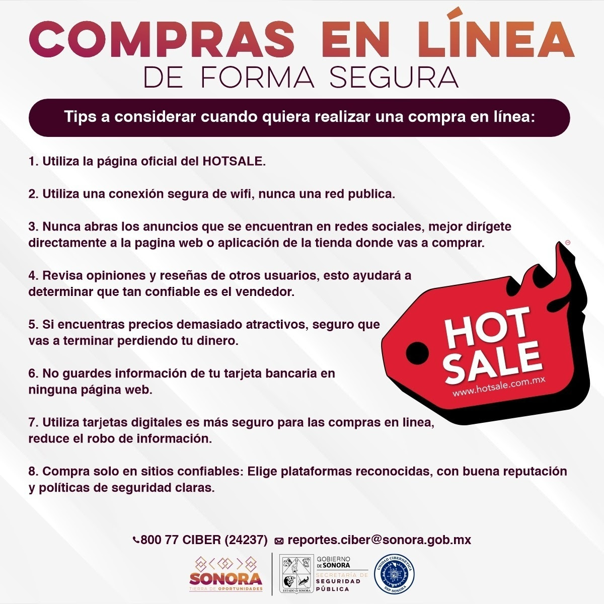 Para recibir asesoría sobre compras seguras durante el Hot Sale, que finaliza el próximo 3 de junio, se puede llamar al 800 77 24237 o escribir al correo electrónico reportes.ciber@sonora.gob.mx.