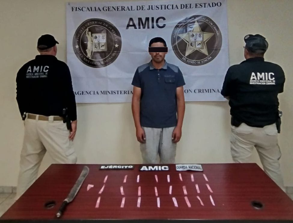 San Luis Río Colorado, Sonora, 8 de junio de 2025.- La Agencia Ministerial de Investigación Criminal (AMIC), en coordinación con la Secretaría de la Defensa Nacional (DEFENSA), la Guardia Nacional (GN) capturó durante un operativo coordinado a Leonardo Daniel “N”, de 29 años, asegurando además un arma punzocortante y droga.