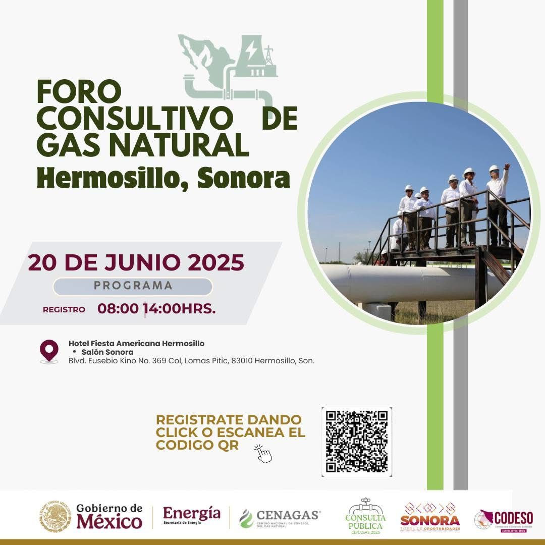 Hermosillo, Sonora; 17 de junio de 2025.- La Secretaría de Energía y el Centro Nacional de Control del Gas Natural (Cenagas), en coordinación con el Gobierno de Sonora, llevarán a cabo en Hermosillo el Foro Consultivo 2025 “Impulsando la seguridad y continuidad en el suministro de gas natural para Sonora”, el próximo 20 de junio.