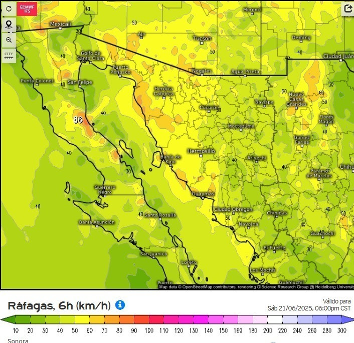 Se prevén vientos sostenidos de 20 a 40 km/h, con rachas que podrían superar los 60 km/h en dichos sectores del territorio sonorense.