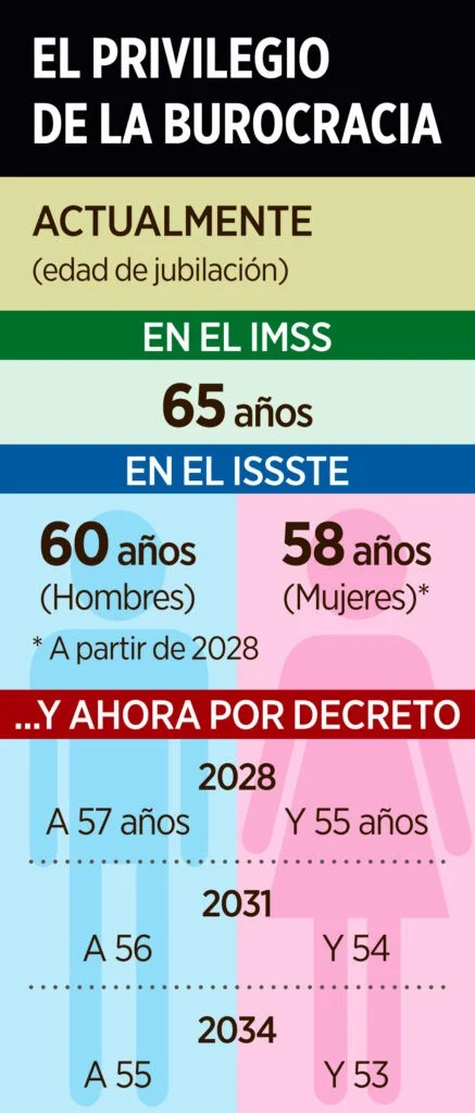 Con el decreto propuesto, la edad de jubilación bajaría a 57 y 55 años en 2028, a 56 y 54 en 2031, y a 55 y 53 a partir de 2034, siempre y cuando el trabajador tenga 30 años de labores, y la trabajadora, 28 años.